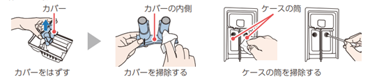 カバー、カバーの内側、ケースの筒に付いた液体洗剤・柔軟剤を、柔らかい布や綿棒などで取り除いてください。