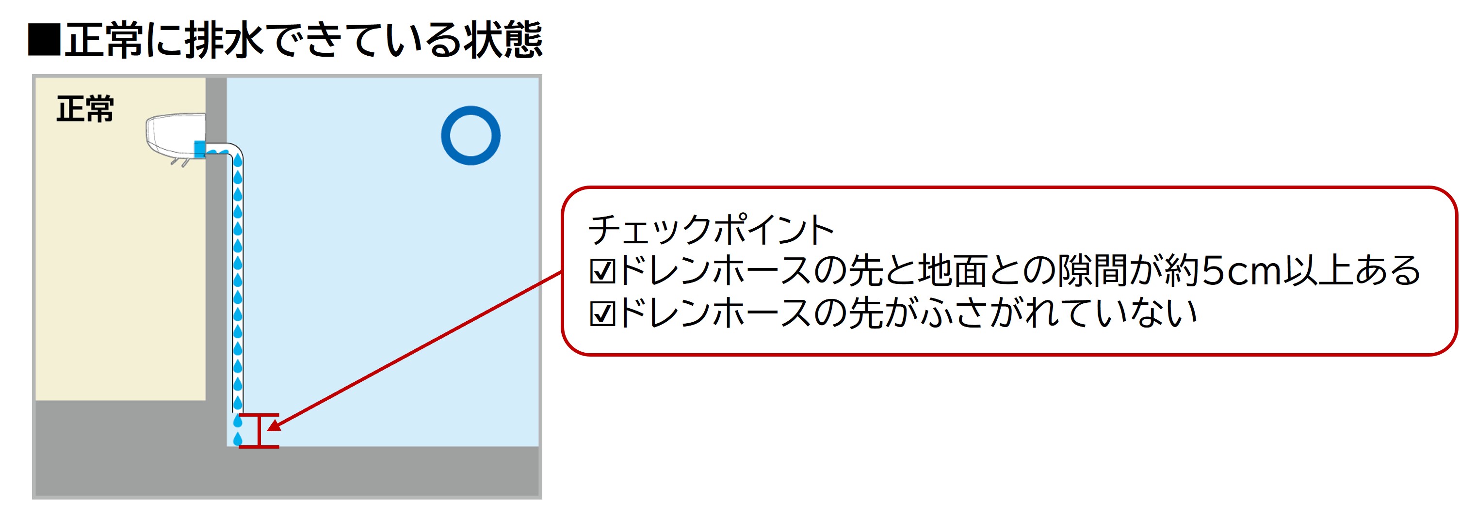 ドレンホース(屋外に水を排出するホース)にかかわるトラブルが想定されます。