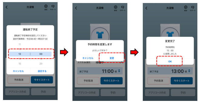 2)変更したい運転終了時間を選択。→「変更」ボタンをタッチする。→「OK」ボタンをタッチする。