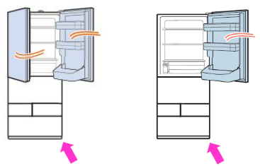 ●扉が左に動く場合、冷蔵庫が左に傾いています。