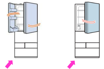 ●扉が右に動く場合、冷蔵庫が右に傾いています。