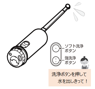 - ノズルの水が出る面を確認し、洗浄ボタンを押して本体内の水を排出する。