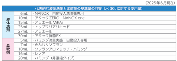 代表的な液体洗剤と柔軟剤の基準量の目安