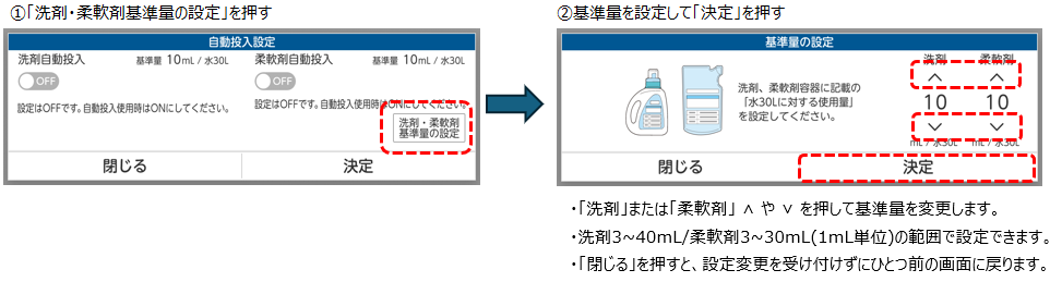 ※初めて使うときや、液体洗剤・柔軟剤の種類を変えるときは容器に記載の「水30Lに対する使用量」を確認し、基準量を設定してください。