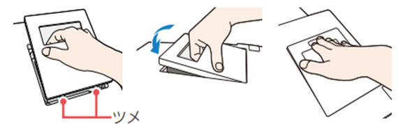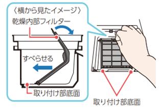 4.乾燥内部フィルター手前部を取り付け部底面にのせてから、矢印の方向にすべらせる