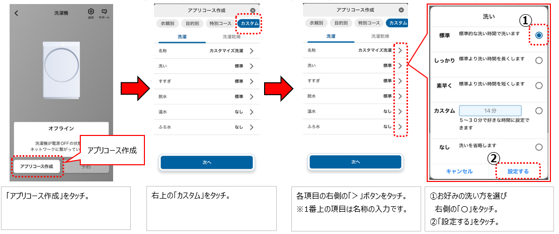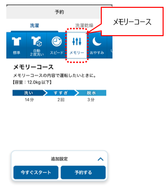 本体側でお好みの行程内容で運転したい場合は、洗濯機本体でメモリーコース設定を行っておくと、設定されたメモリーコースを運転できます。