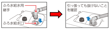 1,本体のふろ水給水口のキャップをはずし、ふろ水給水用接手を確実に差し込む。