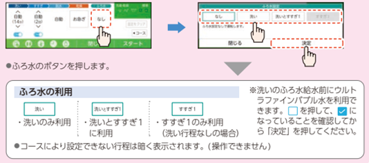 ● 洗いやすすぎの始め(ふろ水を給水する前に、ふろ水ポンプへの呼び水するためです)